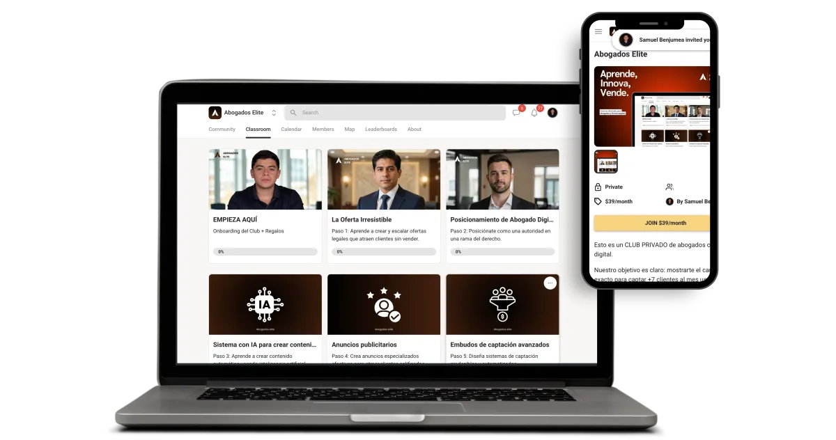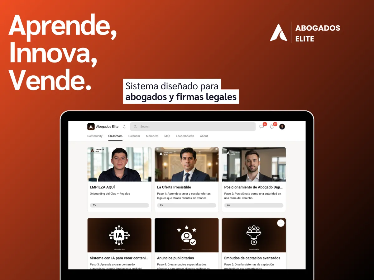 Una suscripción mensual donde ABOGADOS aprenden a crear contenido, lanzar Anuncios y construir su propio sistema para captar clientes en redes sociales, acompañado por una comunidad de profesionales.